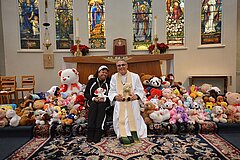 More than 125 Bears, lambs, dogs, kittens etc. were gathered together for the Grace Church Annual Teddy Bear Sunday. Pictured are “Inspired by Grace” Outreach Chairperson Charisse Isip and our Rector, Fr. Walter Hillebrand. Many thanks to our parishioners, Early Childhood Center Parents and friends of Grace for their contributions to this special event. The stuffed animals will be distributed to children who need a little love and hope at area hospitals. God bless you all. (photo by ernest isip)